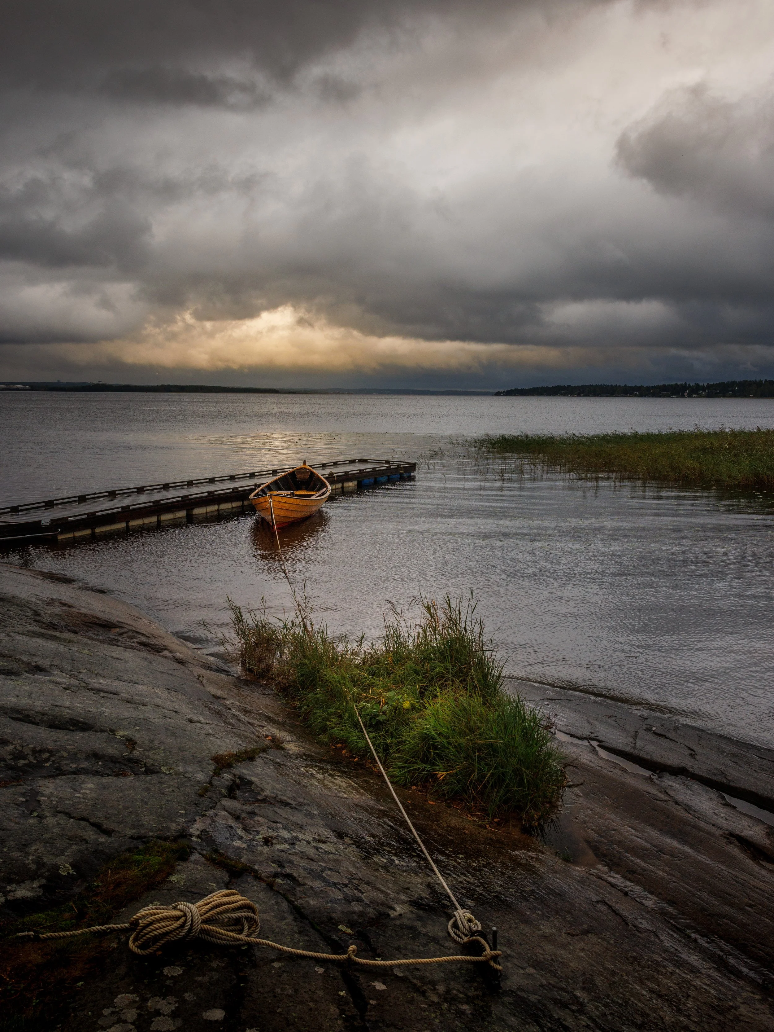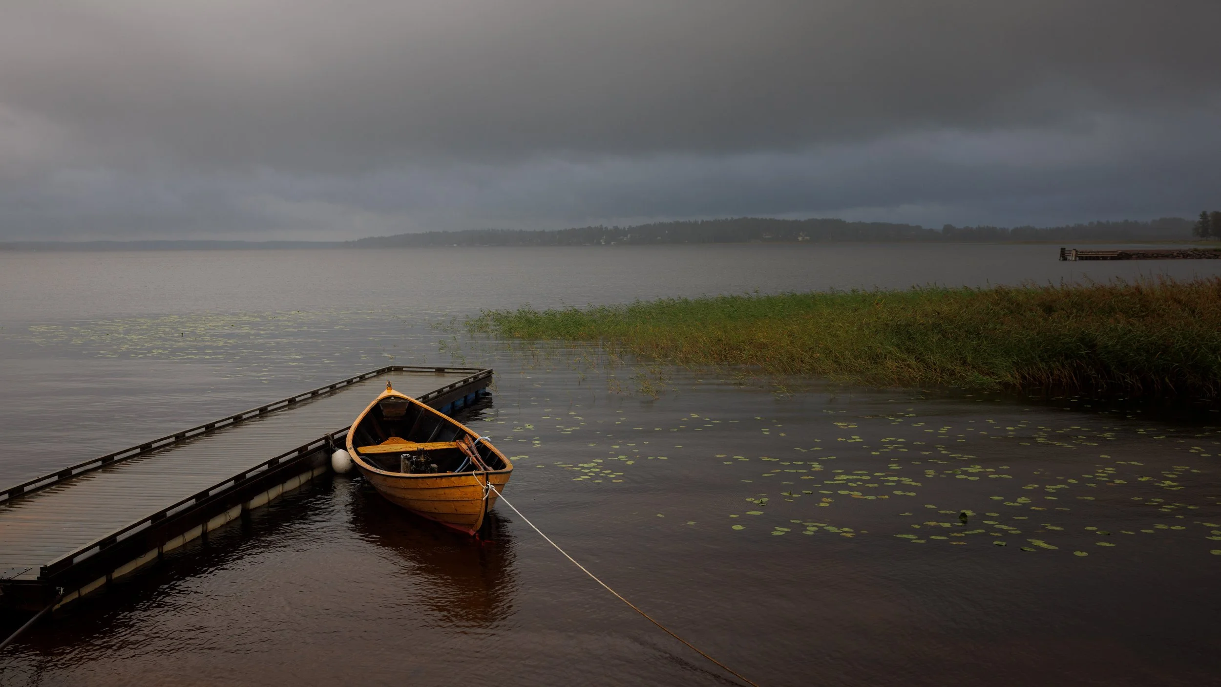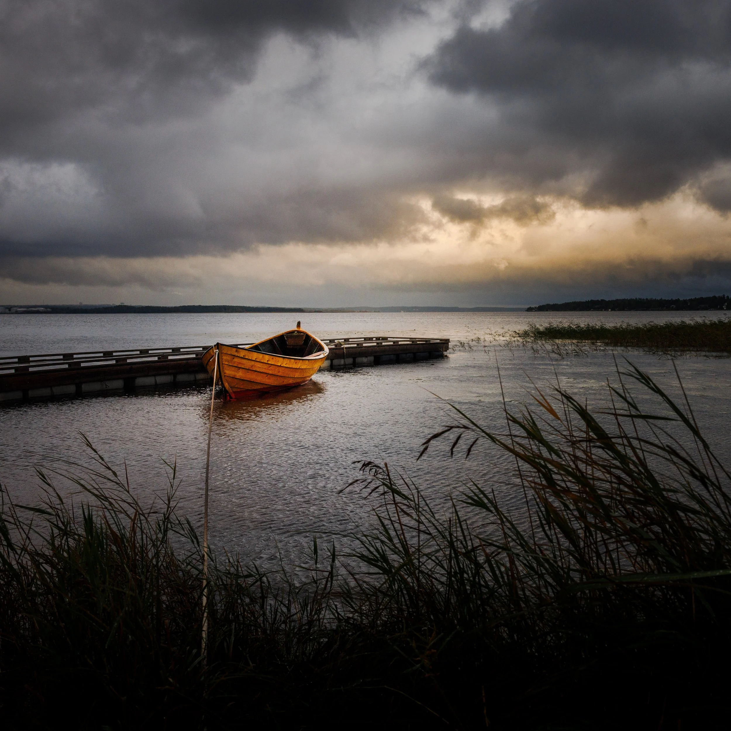 The clouds lingered, heavy and moody, but the downpour gave way to a quiet stillness. And there it was: a small wooden boat, gently tethered to the dock, resting as if it had been waiting all day for its moment. The water, still carrying traces of the storm, reflected the subdued light in a way that felt almost cinematic.